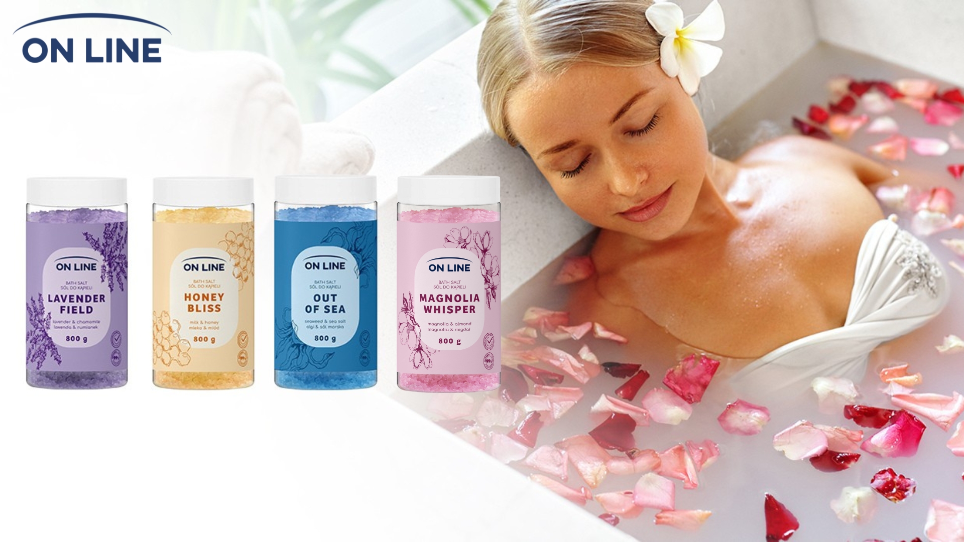 Gama ON LINE include creme de mâini, geluri de duș și chiar săruri de baie cu arome captivante precum Magnolia și Lotus, Aloe și Măsline, Lavandă și Mătase și Mango și Busuioc. Aceste produse vegane și naturale sunt concepute pentru a curăța delicat și a oferi hidratare. In acelasi timp sunt perfecte pentru rutina zilnică. ON LINE oferă esența îngrijirii naturale, simple și plăcute.